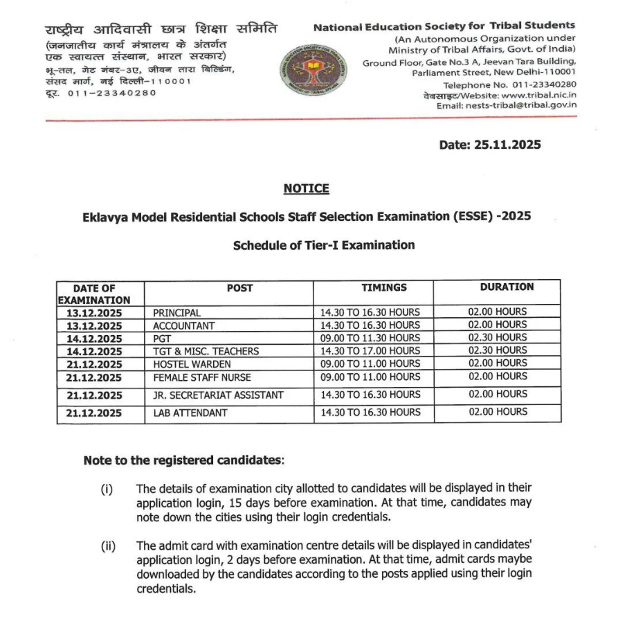 The EMRS Teaching & Non-Teaching Admit Card 2025 has been released for candidates appearing in the recruitment examination scheduled on 13, 14, and 21 December 2025. This exam is a major opportunity for individuals aiming to secure positions in Eklavya Model Residential Schools across various states. The admit card provides essential details such as exam date, reporting time, allotted shift, examination center, and important candidate instructions.