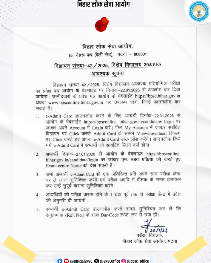 According to the official schedule, the Special School Teacher Admit Card is expected to be available from 22 January 2026. The admit card will be released only through the official BPSC website.