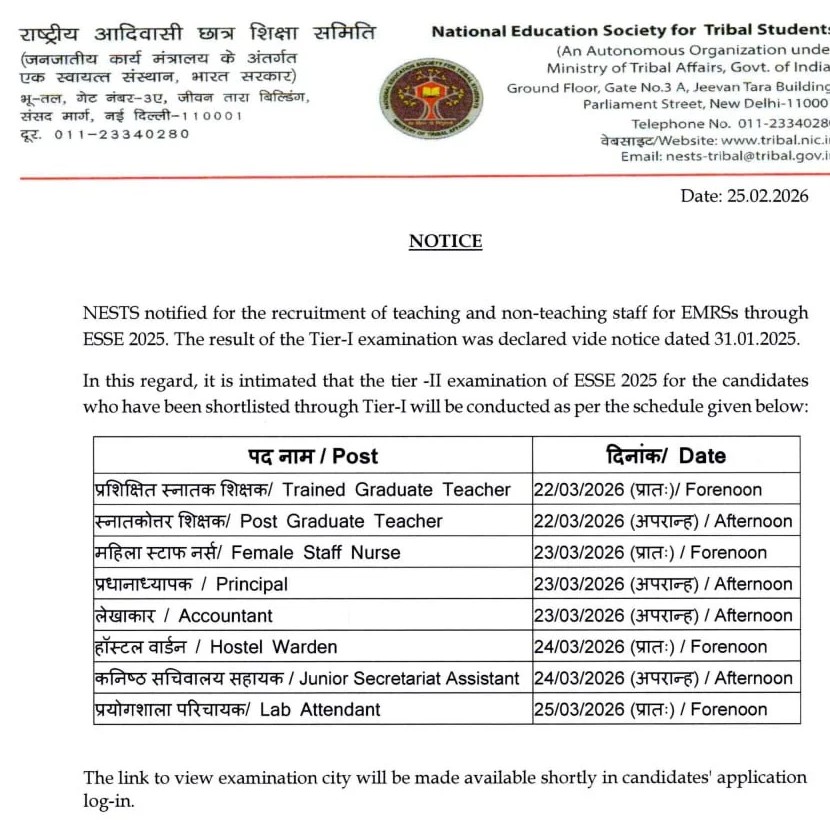 The Eklavya Model Residential Schools (EMRS) has released the Tier II Exam City Details 2026 for various teaching and non-teaching posts. Candidates who qualified in earlier stages can now check their allotted exam city for the upcoming Tier II examination.